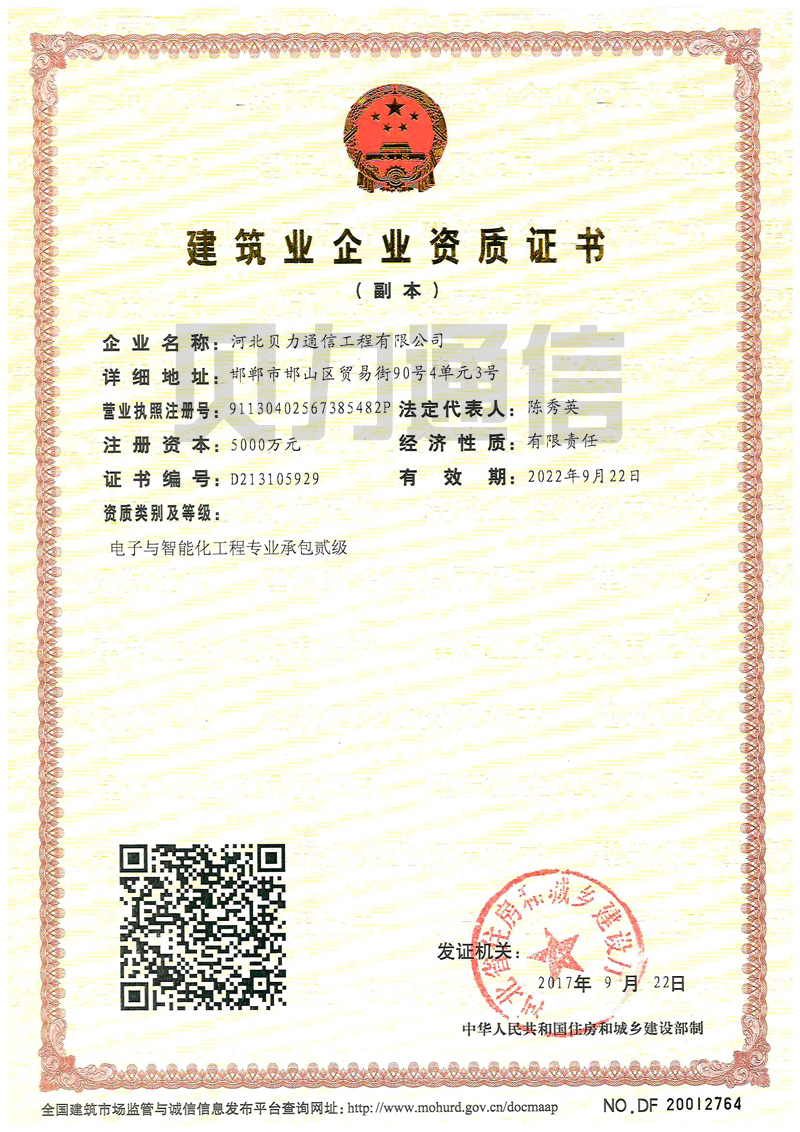 恭喜河北贝力通信工程有限公司于2017年9月22日荣获“电子和智能化工程专业承包二级”建筑业企业资质证书。