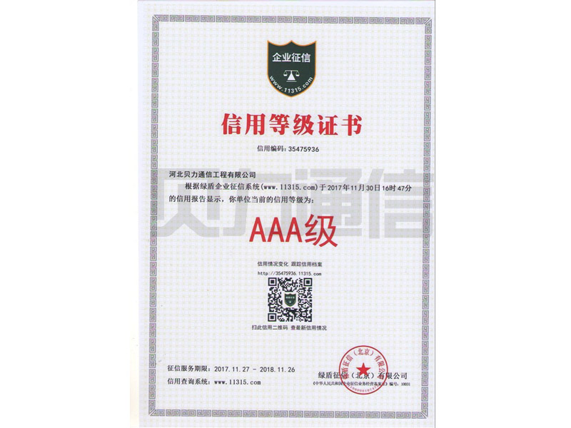恭喜河北贝力通信工程有限公司获得AAA级信用等级证书。