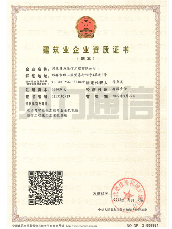 恭喜河北贝力通信工程有限公司获得建筑业企业资质证书。